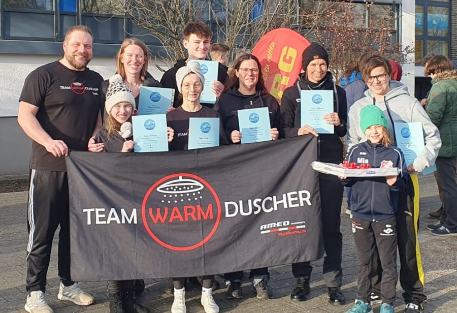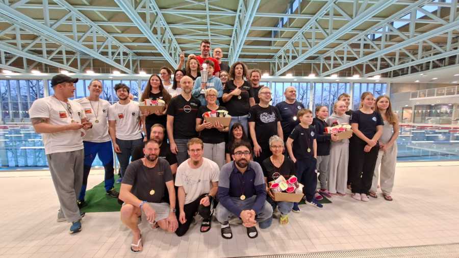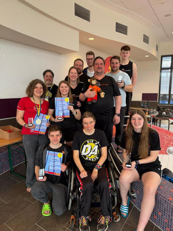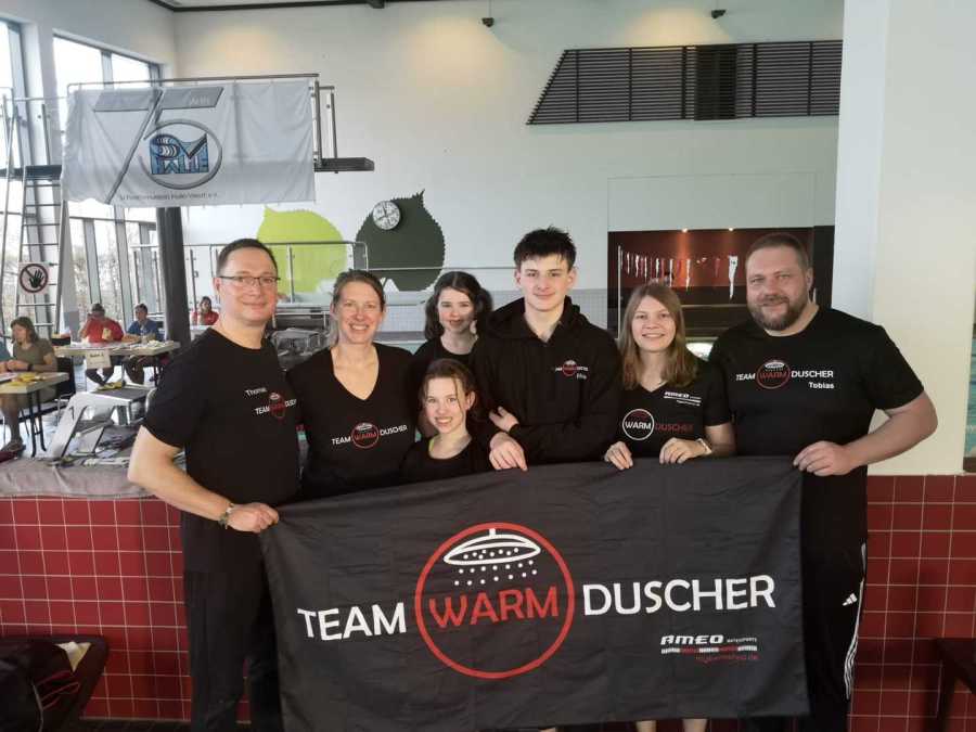 (Sab) In Halle Westfalen findet zum 37. Mal das 24h Schwimmen statt. Team Warmduscher ist mit acht Schwimmern (jung und jünger) vertreten. Mit teilweise 20 Leuten auf der 25m Bahn ist das Schwimmen eine Herausforderung. Während die eine Hälfte schon fleißig schwimmt, tümmelt sich die andere Teamhälfte im Lehrschwimmbecken bei Toberei oder nutzt dort das angebotene Aquafitness Programm. Eine zusätzliche Sporteinheit während der Schwimmpause könnte man sagen. In der Nacht springen alle Erwachsenen nochmal ins Wasser. Sowohl auf der gemütlichen Bahn mit Tobias und Sabrina, als auch auf der ambitionierten Bahn mit Kai, Thomas und Jana, werden bis in die frühen Morgenstunden geschwommene Meter gesammelt. Dieses Wochenende liegt der Fokus nur auf ein geselliges Miteinander und dennoch erreicht Team Warmduscher in der Gruppenwertung den 3.Platz. Überraschend erreichen Fabian, Amelia, Sarah und Sabrina mit durchschnittlich 8050m den 2.Platz in der Familienwertung und dürfen aufgrund der Abwesenheit der Siegerfamilie den Präsentkorb mit nach Hause nehmen! Zudem hat Jana nachträglich ihren Youngstar 2025 Pokal bekommen und diesen mit einem glücklichen Grinsen im Gesicht mit nach Hause nehmen können.