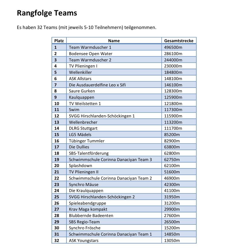Am Ende gewinnt Team Warmduscher mit 220.300m den 1.Platz in der mixed Gruppenwertung und holt sich den Gesamtsieg aller Gruppen!